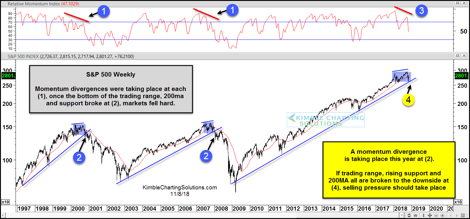 Kimble Charting Solutions The above chart tracks the S&P 500 Index SPX, -1.97% as well as week-by-week momentum in the index. While momentum has come down from its historic highs, it’s nowhere near levels indicating the market is oversold. More worrying is that the divergence in momentum in recent months looks very similar to patterns seen in the run-up to bear markets in 2000 and 2007.